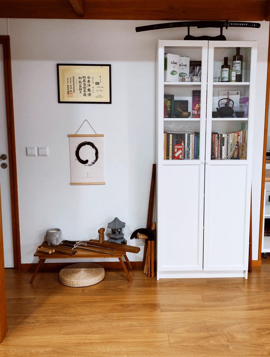 The dojo offers a bright and welcoming room, with access to an outdoor area with a pergola, ideal for practices in the open air, even on days of intense sun or light rain. This peaceful environment allows each session of yoga, meditation, martial arts, or other body practices to take place in full harmony with the surrounding natural landscape.